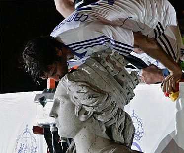 Ramón Calderón aseguró que el Real Madrid ya ha recibido el "visto bueno" del Ayuntamiento para que Raúl acceda a la fuente de La Cibeles a través de una pasarela para coronar a la Diosa y festejar la Liga, cuando se consiga.
